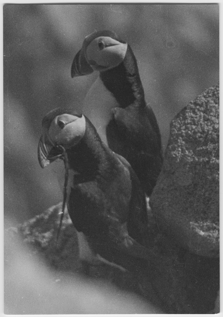 'Lunnefåglar, 2 fåglar i profil, närbild vid stenblock. :: :: Ingår i serie med fotonr. 3382-3407.'
