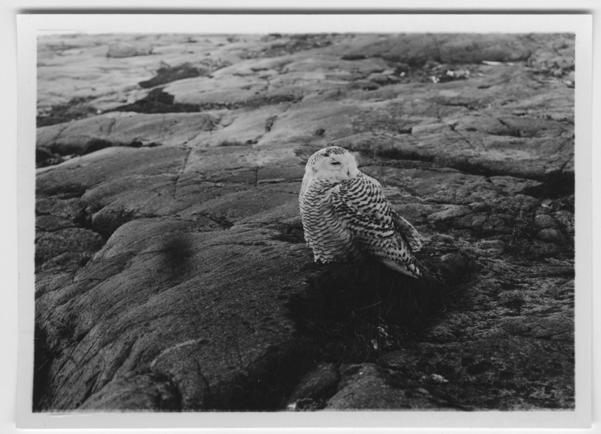 'Fjälluggla sittande på berghäll, närbild snett framifrån. :: :: Ingår i serie med fotonr. 2266-2271.'