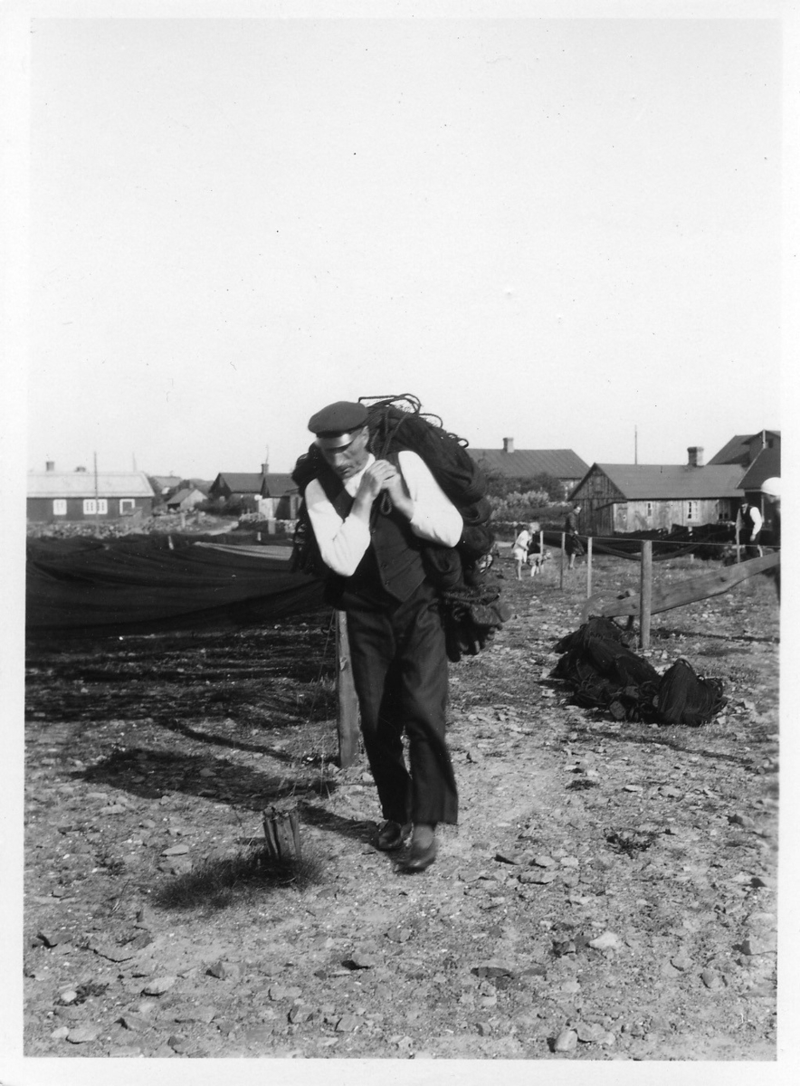 'Akka-expeditionen sommaren 1930: :: :: Fiskeläget i Träslöv. En man bär garn. :: :: Ingår i serie med fotonr. 2033-2087.'