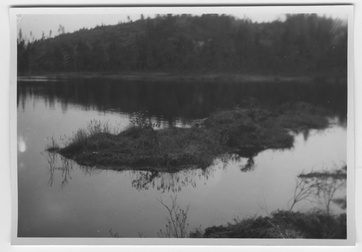 'Smålom, bo i en tjärn i Hindåstrakten, vy. Boet på en holme i tjärnen. Barrskog i fonden. Se även fotonr. 1329. :: :: Se serie med fotonr. 1305-1356.'