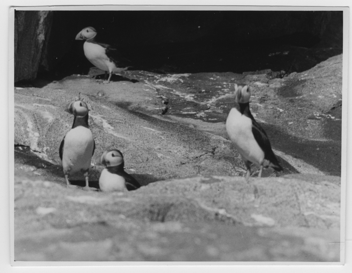 Titel: '4 st lunnefåglar på berghäll, i närbild. :: :: Se serie med fotonr. 3726-3729.'