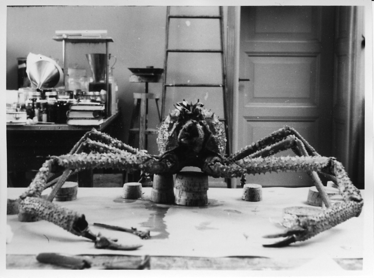 'Bilder från ateljen vid monteringen av ''häxkrabban''. Fynddatum: 1955-07-01. :: :: Fotograferad framifrån. :: :: Den japanska jättekrabban finns utställd i monterskåp nr. 94. :: :: Ingår i serie med fotonr. 5674:1-4.'