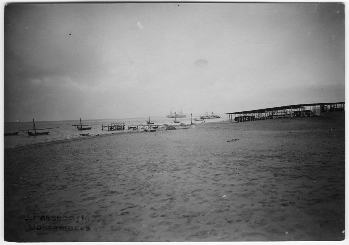 'Vy med större och mindre båtar i havet och på stranden, liten brygga och någon form av båtskjul på stranden. :: :: Ingår i serie med fotonr. 6999:1-3, foton som ligger i Arkivnummer 1190 på Göteborgs Naturhistoriska museum.'