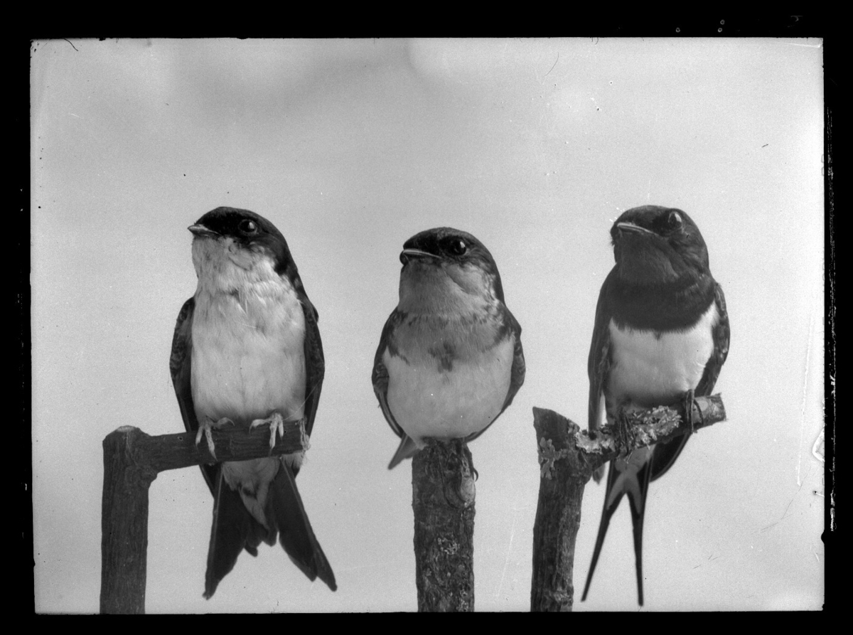 'Bastard mellan hussvala och ladusvala, hona adult, i mitten. På sidorna om bastarden är de båda föräldraarterna . Fåglarna sedda framifrån. :: :: Bilden med i Göteborgs Naturhistoriska Museums Årstryck 1934 s. 54.'