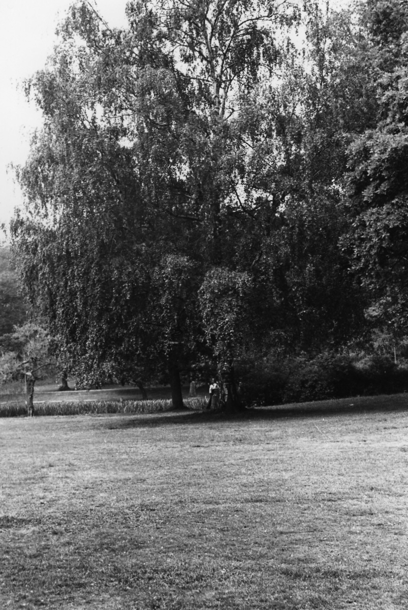 'Trädutställningen 1978 Göteborgs Naturhistoriska museum: :: samma vy som 5527:51, men människor vid björkens stam. :: :: Ingår i serie med fotonr. 5527:50-68.'