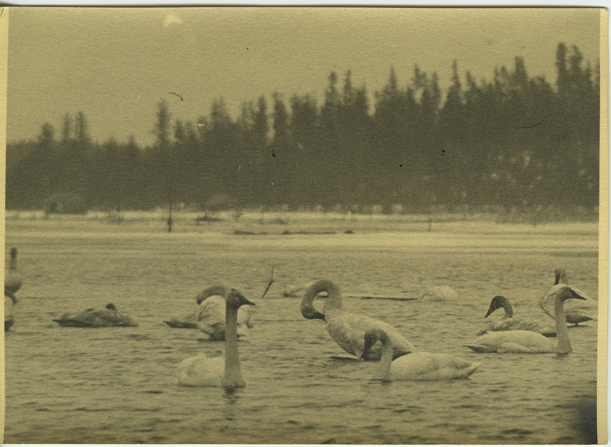 'Cirka tio sångsvanar, i vatten. Ridå av skog i bakgrunden. :: :: Ingår i serie med fotonr. 998-1001.'