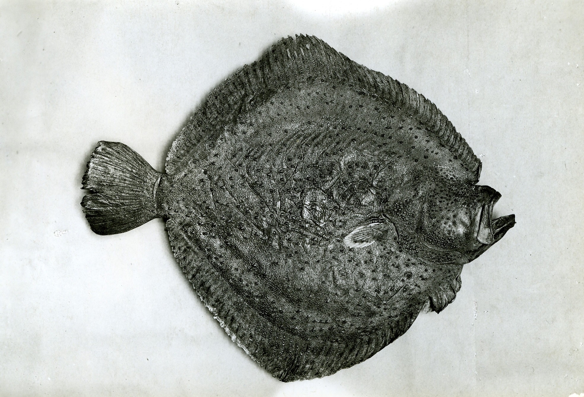 'Piggvar, blindsida, båda sidor taggiga och mörka, högerögat abnormt placerat. Längd 58,5 cm. Inkom 1913-01-13. :: :: Bilden med i Göteborgs Naturhistoriska museums Årstryck 1914 s.34'