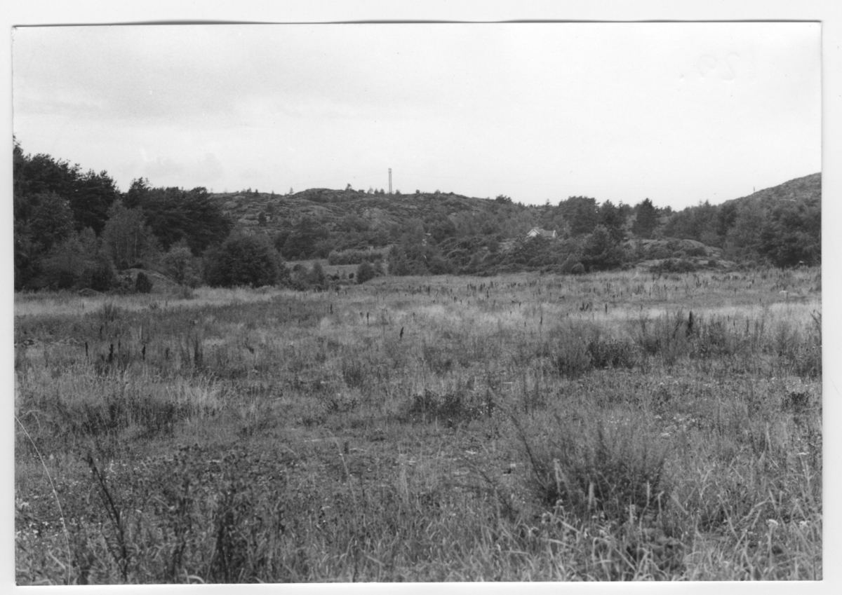 'Bildtext: ''Kärr. Riktning 300.'' Vy över kärr med berg och trädvegetation i fonden. :: :: Ingår i serie med fotonr. 6970:1-1125, dokumentation av Hisingens naturgeografi, visande landskapsformerna i stora drag och gjord inför exploateringen av området. Platserna för fotograferingen finns utsatta på karta i skala 1:4000 som finns på Göteborgs Naturhistoriska musem. Fotoriktningen mättes med kompass i gammalgrader.'