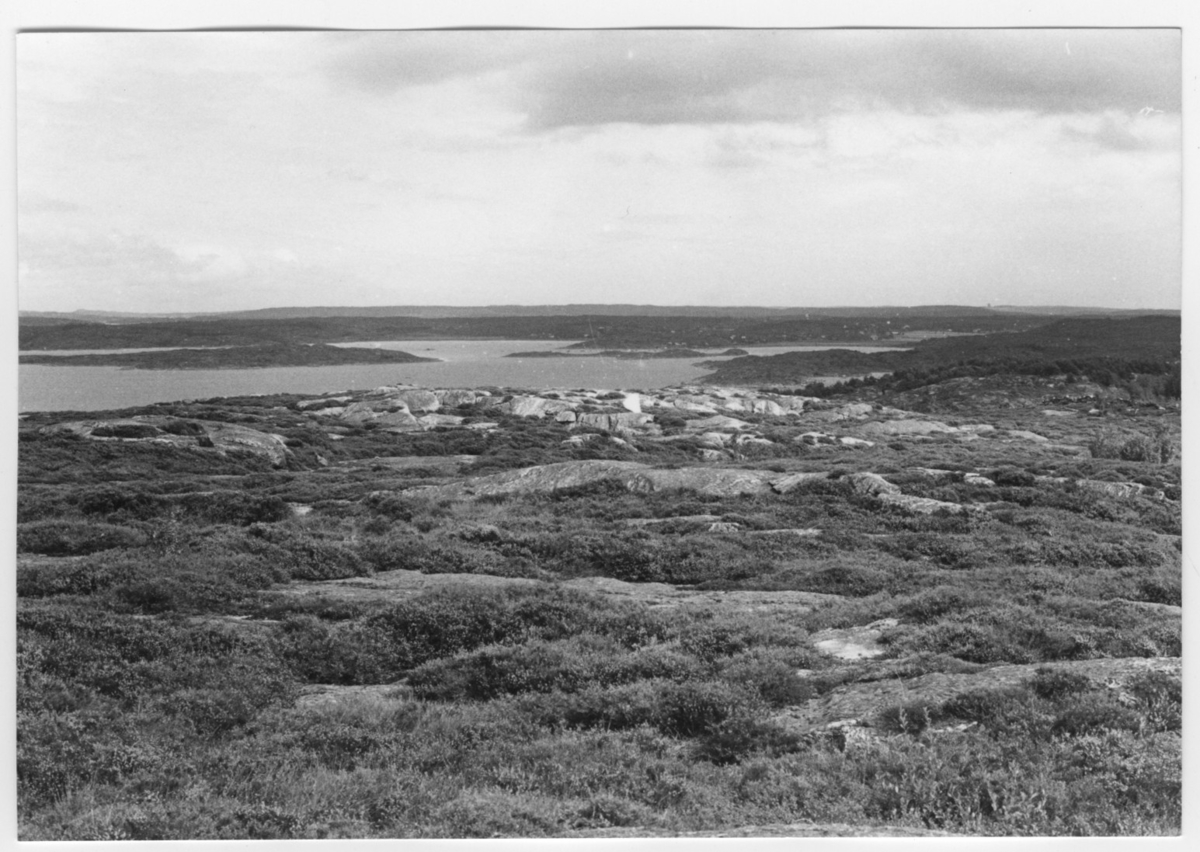 'Bildtext: ''Hällparti. I bakgrunden Nordre Älv. Riktning 58.'' :: Vy över berghällar med ljungvegetation och på avstånd troligen enbuskar. :: :: Ingår i serie med fotonr. 6970:1-1125, dokumentation av Hisingens naturgeografi, visande landskapsformerna i stora drag och gjord inför exploateringen av området. Platserna för fotograferingen finns utsatta på karta i skala 1:4000 som finns på Göteborgs Naturhistoriska musem. Fotoriktningen mättes med kompass i gammalgrader.'