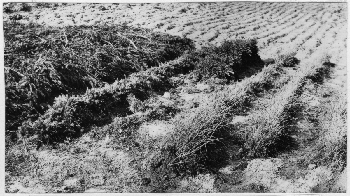 'Bildtext: ''Jordslagna plantor, de till vänster är övertäckta med granris.'' Närbild på odling av granplantor. :: :: Fotonr. 7046:307-328 indelade som ''Skogsodling och självsådd.'' Ingår i serie med fotonr. 7046:1-383, 7047:1-33 och 7048:1-67 med bilder från Länsjägmästare John Lindners bildarkiv.'