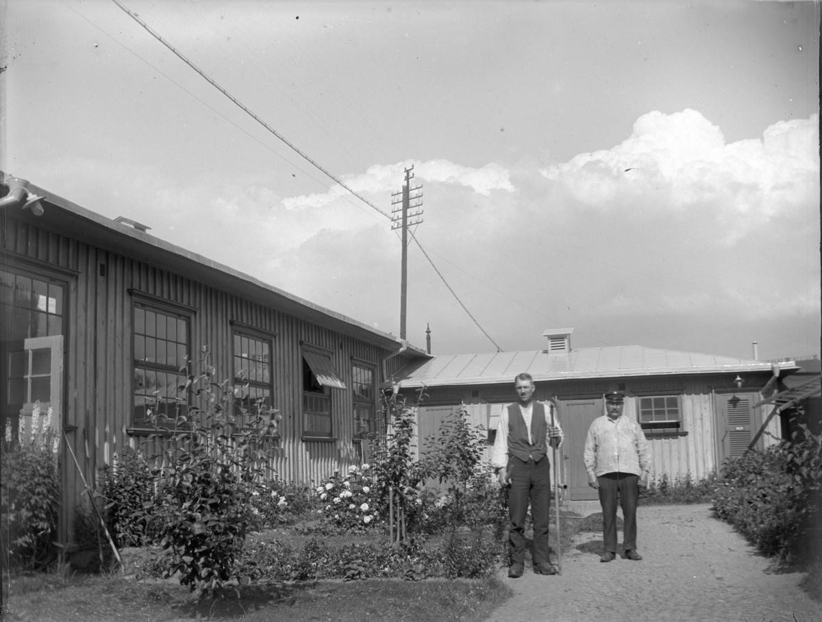 'Vy med 2 män stående på grusgång i trädgården till ett trähus. Trädgårdsväxter. :: :: Ingår i serie med fotonr. 5236:1-11.'