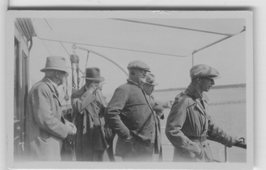 'Biologiska föreningens utfärd till Öland. :: :: Text enligt foto: ''Hemfärd från Färjestaden till Kalmar.'' 5 st män står ombord på färjan. Leonard Axel Jägerskiöld med pipa i munnen. Björn Wennerberg till höger. :: :: Se även fotonr. 2607-2625, 2583-2606 samt 2883-2911 från samma utfärd.'