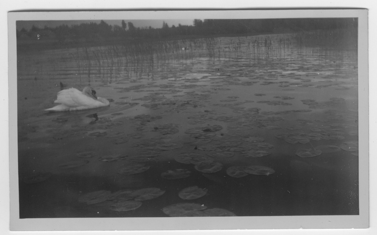 '1 st knölsvan i sjön omgiven av näckrosblad. :: :: Text på baksidan av fotot: ''Knölsvanhannen sprudlar av ilska på sjön.'' :: :: Ingår i serie med fotonr. 4500:1-172.'