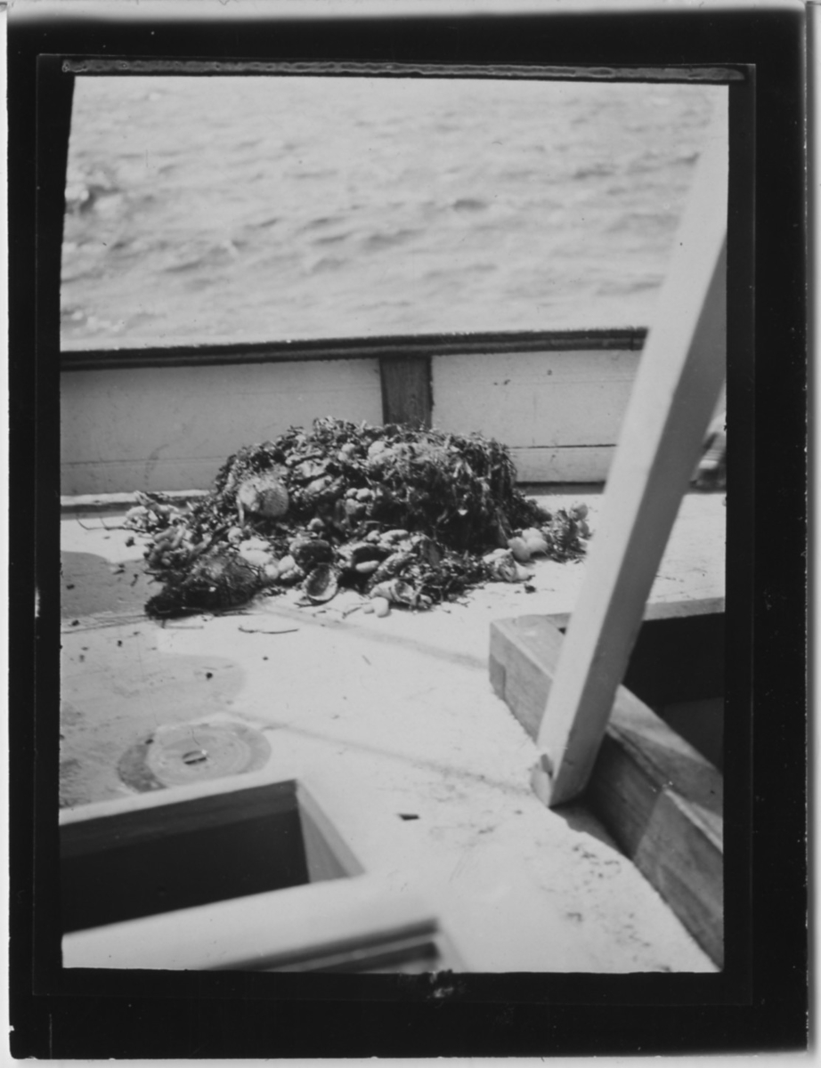 'Biologiska föreningens utfärd till Kristineberg: :: :: Upptaget från havet - liten hög, ombord på båten, med tång, snäckskal samt ev. sjöborre. :: :: Ingår i serie med fotonr. 4242:1-14.'
