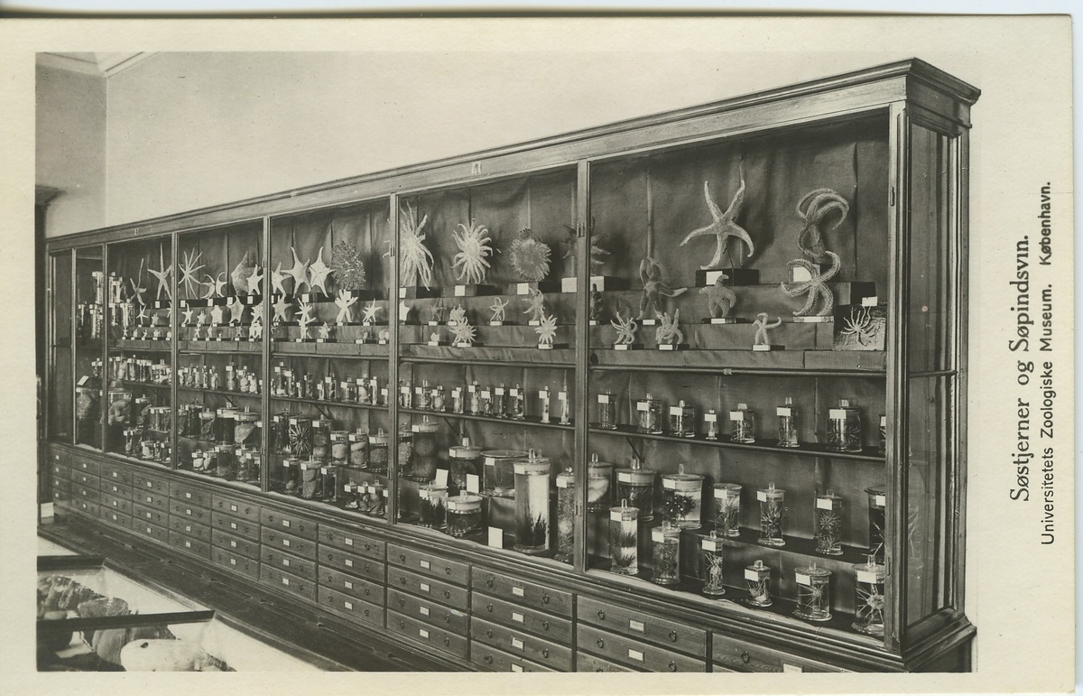 'Sjöstjärnor och sjöborrar. Preparat i glasburkar samt monterade. :: Oskrivet vykort från Universit. Zoolog. Museum, Köpenhamn, 1925. :: :: Ingår i serie med fotonr. 1003-1014.'