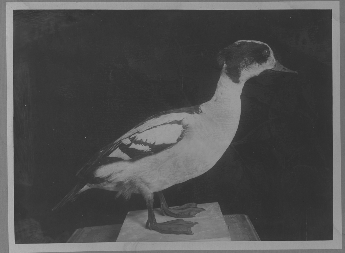 'Korsning mellan knipskrake och salskrake, monterad, sedd framifrån. Tillhör Vänersborgs museum. :: :: Publicerad i Fauna o Flora 1915 s.45. :: :: Se även fotonr. 224.'