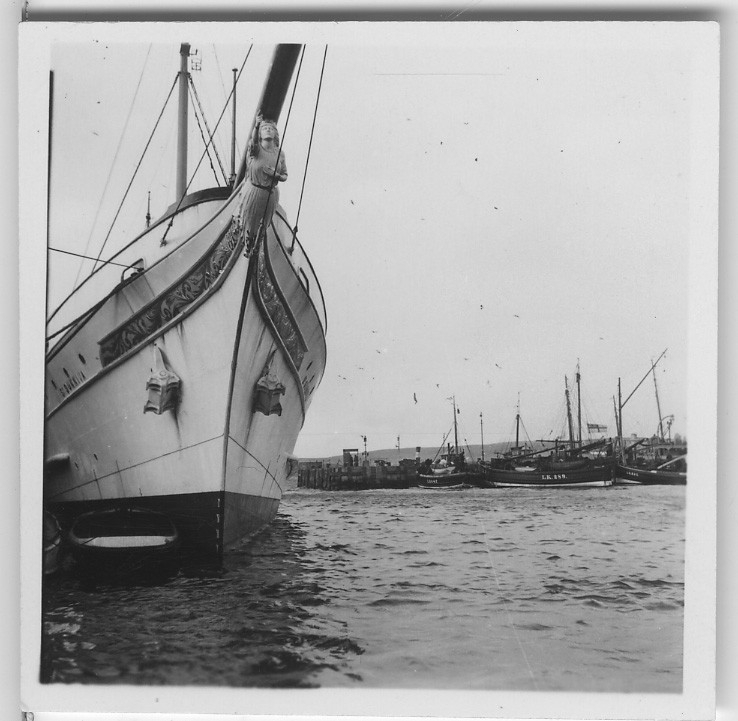 'Från ''Skageraks''-expeditionen till Hebriderna och Shetland: :: :: Lerwicks hamn, med båt för i förgrunden, galjonsfigur synlig. :: :: Ingår i serie med fotonr. 4113:1-82.'