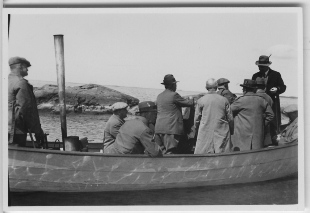'Biologiska föreningens utfärd till Läckö och Ekens skärgård: :: :: Ca 9 sittande och stående personer i liten (motor)båt. Vy ut mot öppet vatten, sjön. :: :: Se fotonr. 3242-3254, 3255, 3256-3259, 3260-3285 samt 3889-3894.'