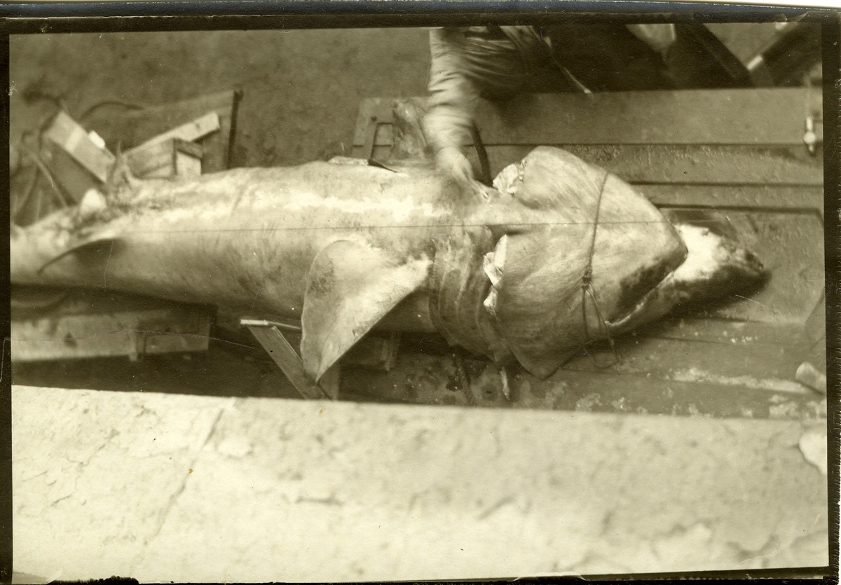 'Brugd, hane juv. strandad vid Knösund, Kyrkosund, sedd från undersidan. Utanför museét, kroppens undersida. Coll.an. 3396-3400. Fynddatum: 1914-02-06. :: :: Ingår i serie med fotonr. 545-557:7.'