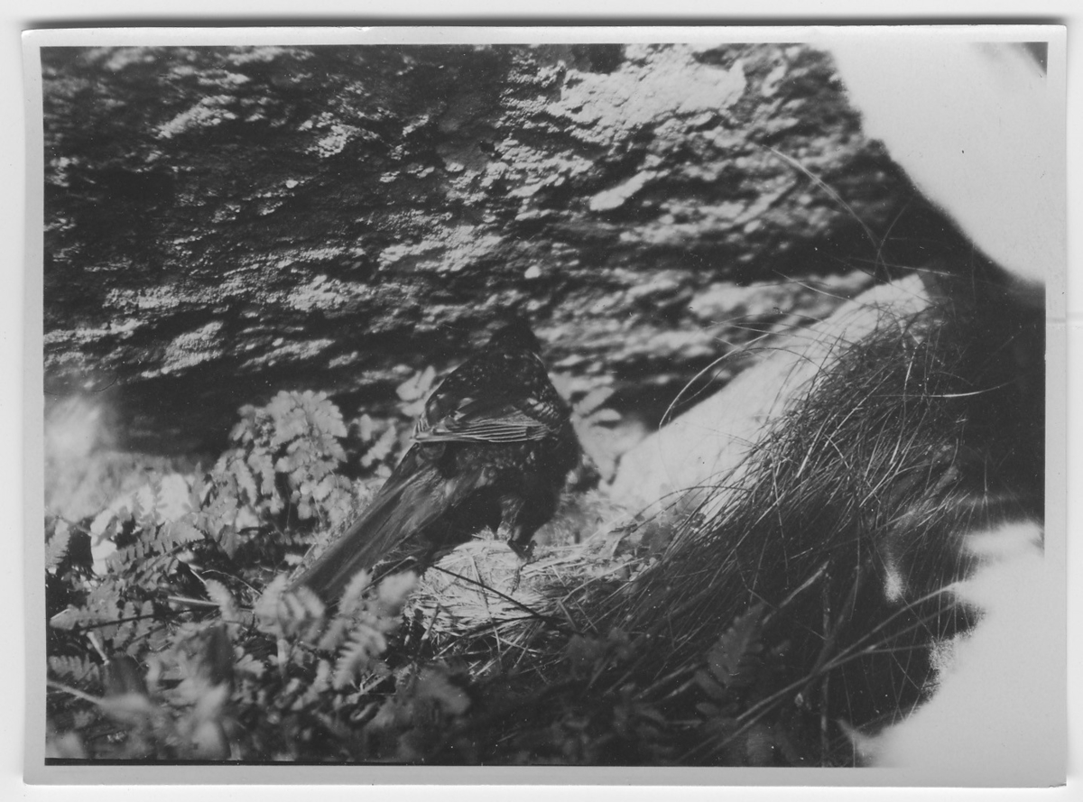 'Ringtrast hona, sittande intill stenblock och ormbunksväxt. Närbild. :: :: Se serie med fotonr. 1305-1356.'