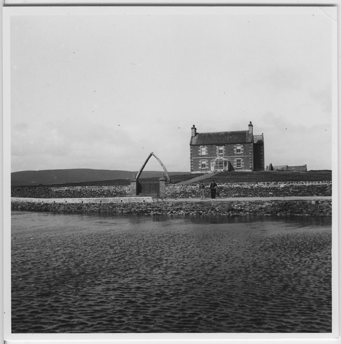 'Från ''Skageraks''-expeditionen till Hebriderna och Shetland: :: :: 2 (män) människor nedanför hotellet i Balta sound. Hotellet är en stenbyggnad med glasveranda, framför byggnaden finns en stenmur med port och gångväg till hotellet (förstorad version av foto nr 4113:69). :: :: Ingår i serie med fotonr. 4113:1-82.'