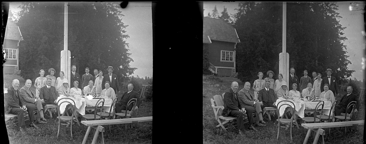 'Bildtext: ''Horn, Malbergs, grupp.'' :: Grupp med ca 16 personer, kvinnor och män, samlade vid ett dukat bord invid en flaggstång. Trästolar, träbänkar. I bakgrunden ett hus. :: :: Ingår i serie med fotonr. 5264:1-16. Se även hela serien med fotonr. 5237-5267.'