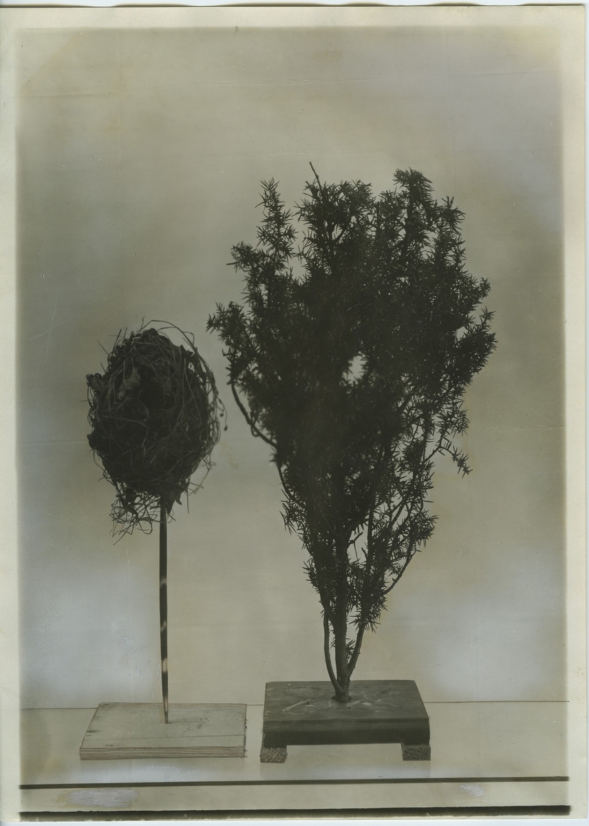'Bo av hasselmus. Monterad enbuske där boet suttit och det monterade boet, var för sig. Fynddatum: 1924-10-12. :: :: Boet utställt i monterskåp i däggdjurssalen på Göteborgs Naturhistoriska Museum (2007-11-01) :: :: Bilden med i Göteborgs Naturhistoriska Museums Årstryck 1926-1927 s. 20.'