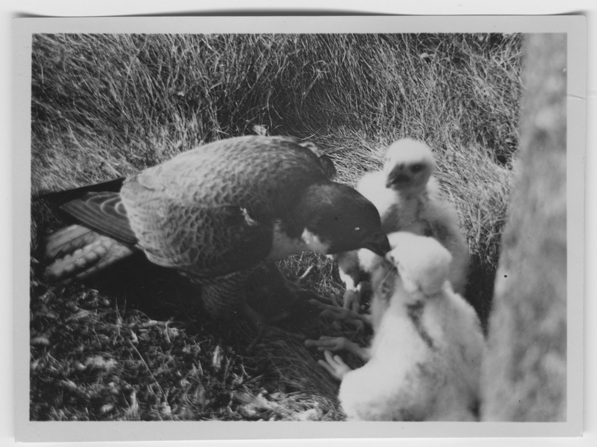 'Pilgrimsfalkhanen matar ungarna, närbild. Intill bergvägg, på klipphylla. :: :: Ingår i serie med fotonr. 1771-1837. Se även fotonr. 3151-3200.'