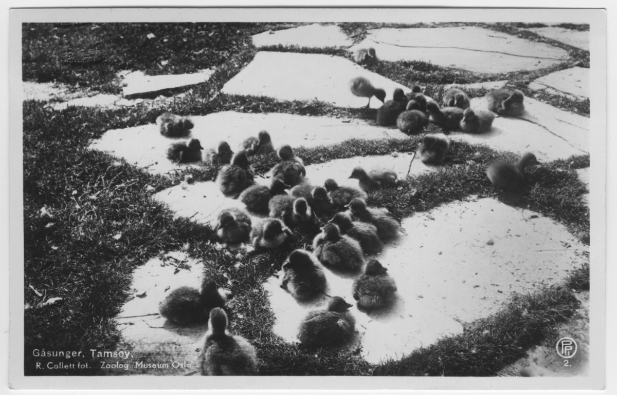 'Gåsungar ca 30 st på stenplattor och gräs. :: :: Ingår i serie med fotonr. 3415-3418.'