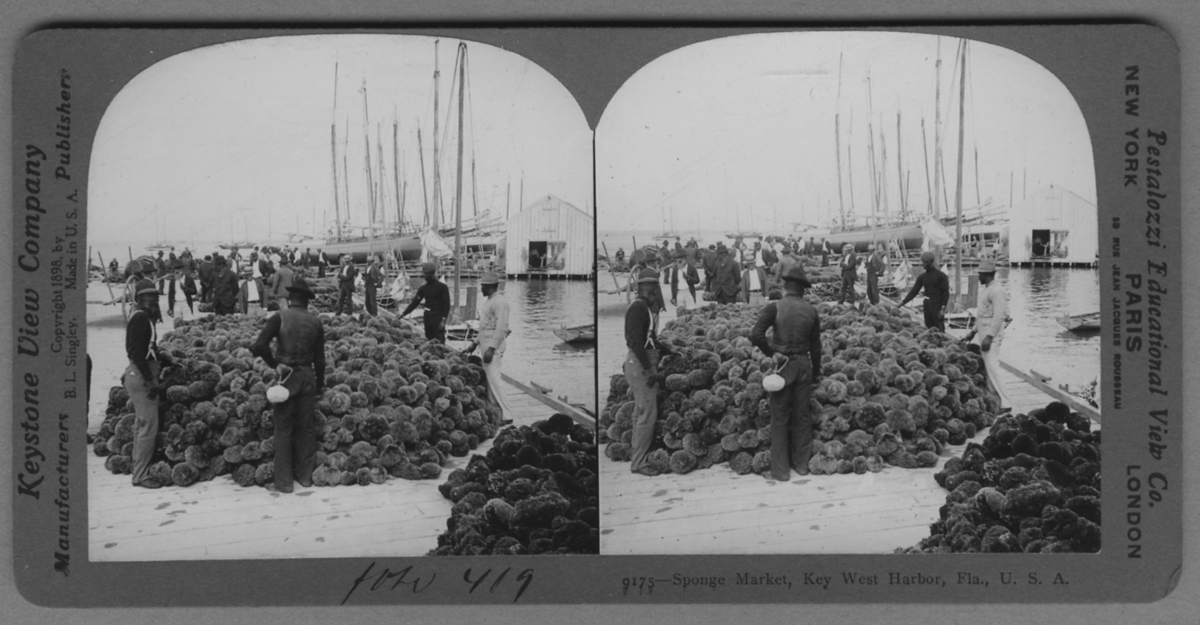 '''tvättsvampsmarknad'' vid hamnen. 2 högar med tvättsvampar i förgrunden, en grupp människor går omkring och tittar. Båtar och byggnader i bakgrunden. :: :: ''9175 - Sponge market, Key West Harbor,Fla., U.S.A.'' :: :: Ingår i serie med fotonr. 315-422.'