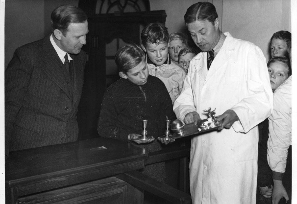 'Miljonte besökaren på Naturhistoriska museet erhåller Göteborgs-Postens minnesgåva: :: :: Orvar Nybelin i vit rock och en man i kostym samt en grupp med 6 barn i bakgrunden. Dörren ut till innergården synlig i bakgrunden. I förgrunden del av barriär med vändkors i gamla entrén.'
