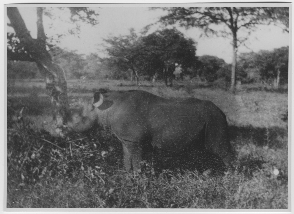 'Noshörning vid träd. Se även fotonr 4338 på samma noshörning. :: :: Ingår i serie med fotonr. 4337-4348.'