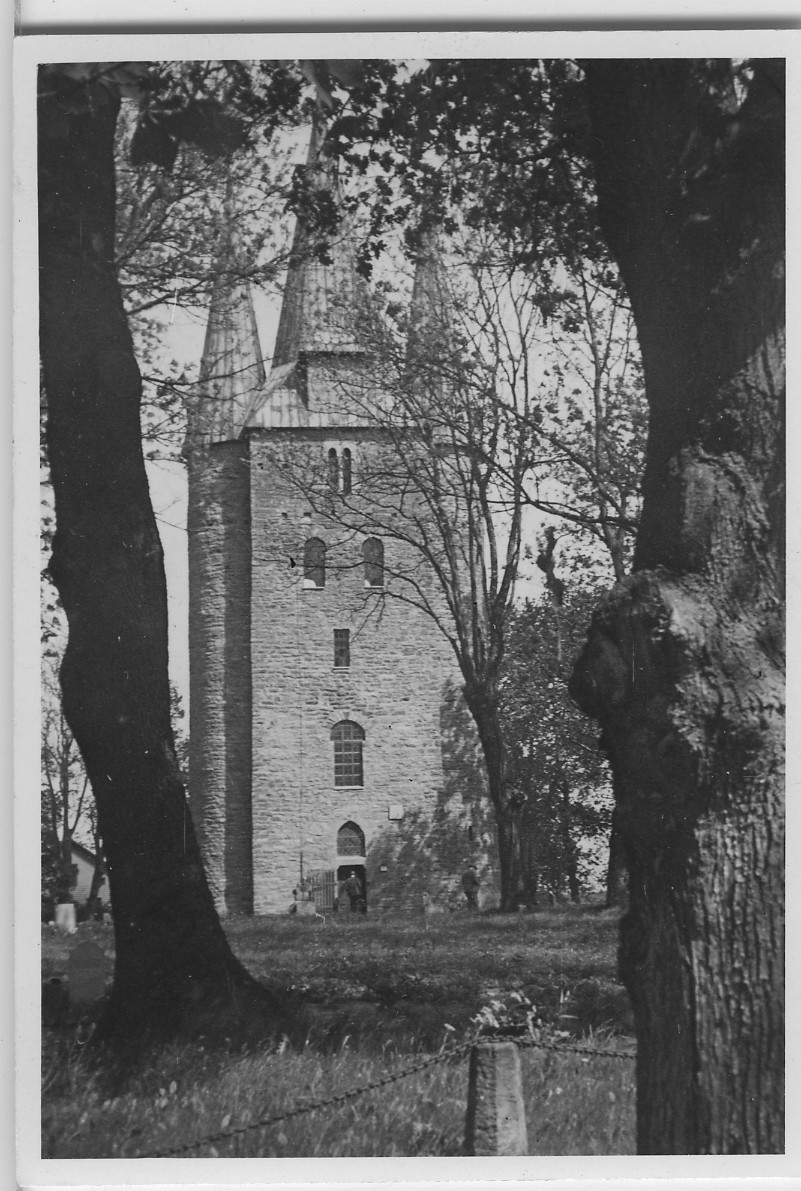 'Ingår serie 4385:1-27 från Biologiska föreningens utfärd till sjön Östen och Kinnekulle. :: :: Husaby kyrka med porten på tornet synlig, sedd från avstånd mellan 2 träd. 1 person framme vid kyrkporten.'