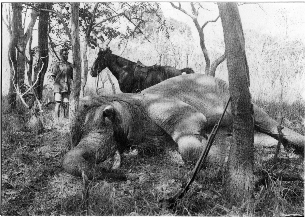 'Diverse fotografier från bl.a. dåvarande Nordrhodesia, nu Zambia, tagna av Konsul Magnus Leijer. :: :: En man stående vid en fälld elefant. I bakgrunden står en häst. Runt omkring är träd och i förgrunden står ett gevär lutat mot ett träd.'