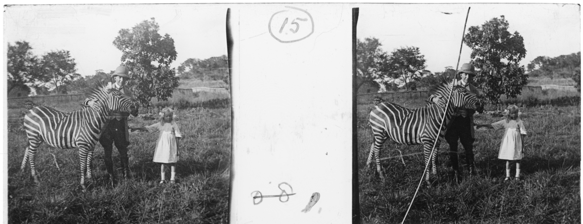 'Magnus Leyer tillsammans med dottern Rhoda vid åsnan ''Billy'', i hage. Byggnad i bakgrunden. :: Enligt text till fotot: ''M.L. and Rhoda, with Billy''. (M.L. och Rhoda med Billy.) :: :: Ingår i en serie med fotonr. 5237:1-16. Se även fotonr. 5238:1-18, 5239:1-18 och 5240:1-17, 5241:1-18. :: :: Rhoda dotter till Magnus Leyer, Rhoda född 1907 i Rhodesia där familjen bodde fram till 1914 då de återvände till Sverige och de återvände inte till Rhodesia på grund av världskriget.'