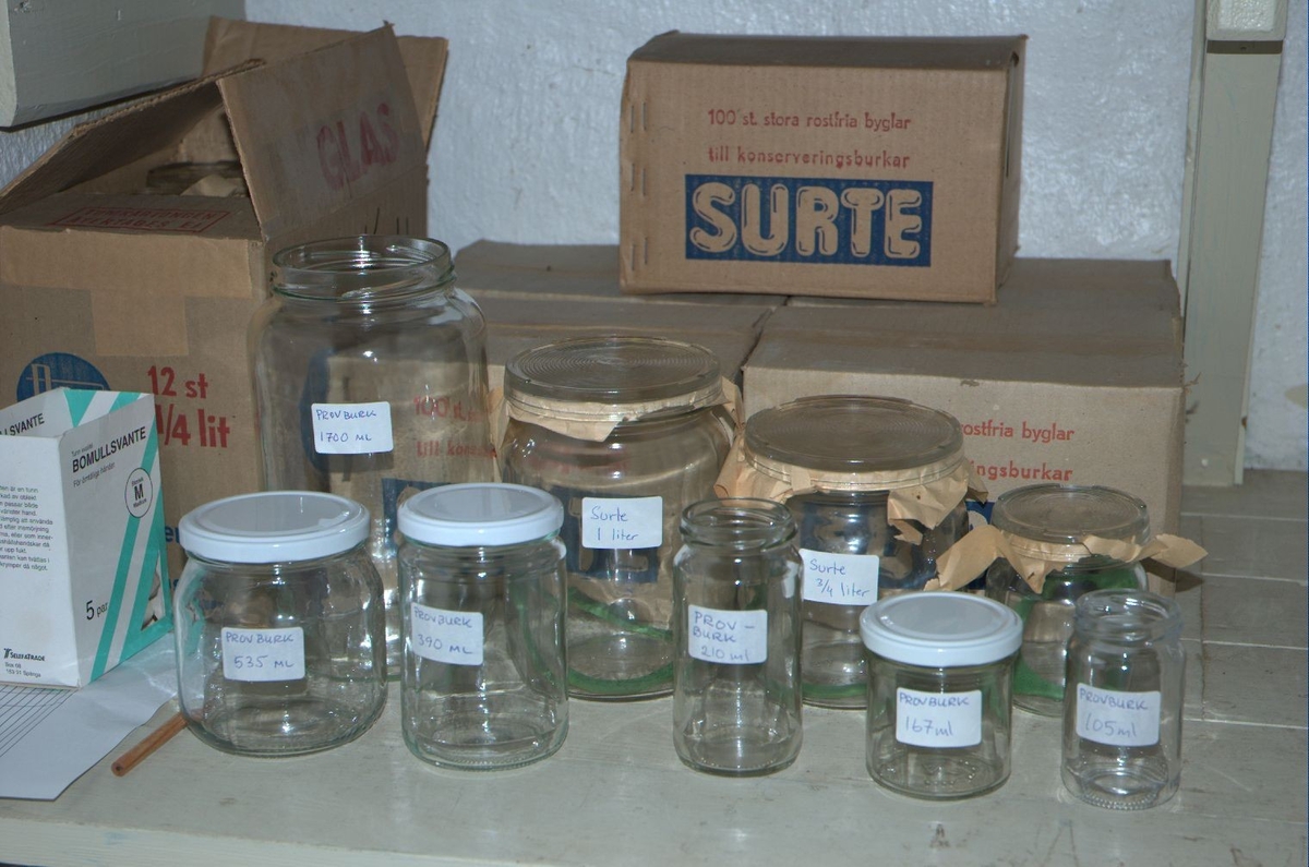 'Närbild på diverse glasburkar, de storlekar som är i användning 2007. :: :: Fotonr. 7095 består av en bildserie som dokumenterar diverse utrymmen i byggnaden så som kontor, arbetsplatser, arbetsrum, magasin m.m. Bilder tagna före och efter olika ombyggnationer bl.a.'