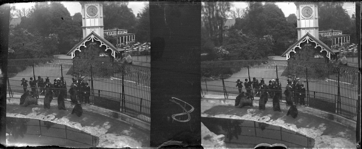 'I förgrunden brjörnhägn med högt gallerstaket, drygt 10 personer vid staketet. I bakgrunden syns byggnad med skylt ''Nr 10 kamelhus''och tornbyggnad med klocka. :: Enligt text till fotot: ''Black and brown bears.'' (Svarta och bruna björnar.) :: :: Ingår i serie med fotonr. 5244:1-19, se även hela serien med fotonr. 5237-5267.'