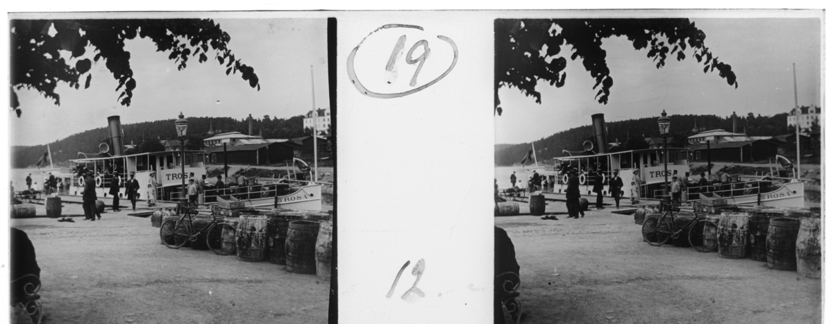 'Bildtext: ''Trip to Lofthus, S.S. ''Trosa'', at Södertälje.'' :: Vy med båten ''Trosa'' i hamn, vy med människor, barn, kvinnor, män, yklar, kärra, trätunnor, lyktstolpe på kaj. Hus i bakgrunden. Livboj. :: :: Ingår i serie med fotonr. 5248:1-20, se även hela serien med fotonr. 5237-5267.'