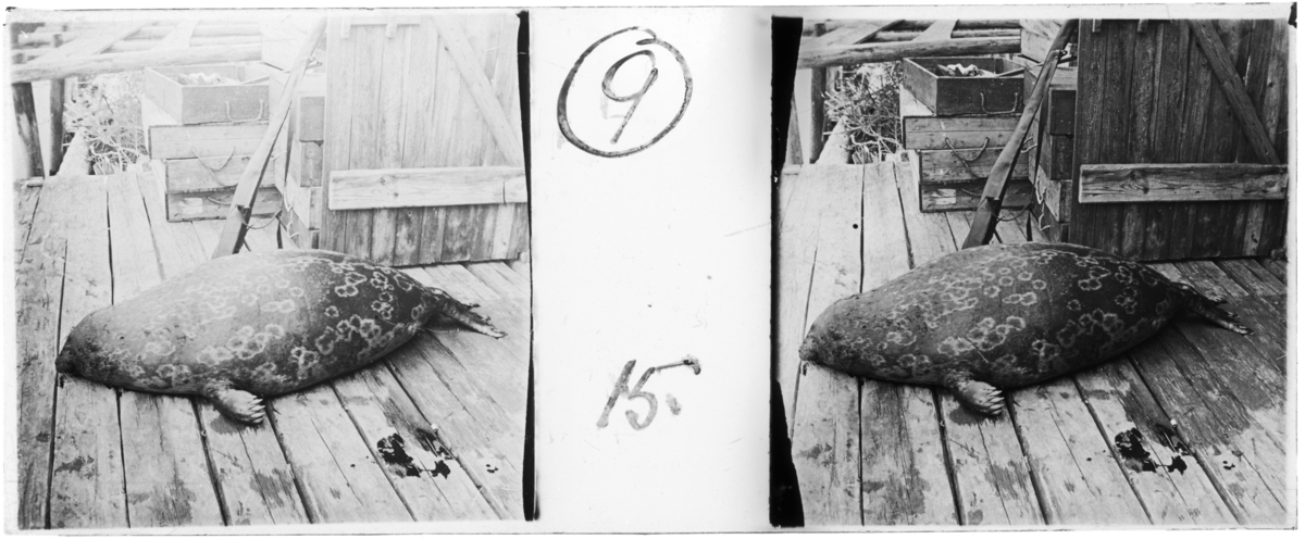 'Bildtext: ''Seal.'' (Säl) :: I fångad (skjuten) säl liggande på bryggan till landningsstället, i bakgrunden står en trave med trälådor. :: :: Ingår i serie med fotonr. 5251:1-21, se även hela serien med fotonr. 5237-5267.'