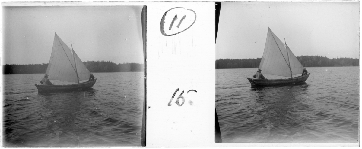 'Bildtext: ''Our boat under sail.'' (Vår båt under seglingen) :: 2 personer i en båt med segel. I fonden skog. :: :: Ingår i serie med fotonr. 5251:1-21, se även hela serien med fotonr. 5237-5267.'