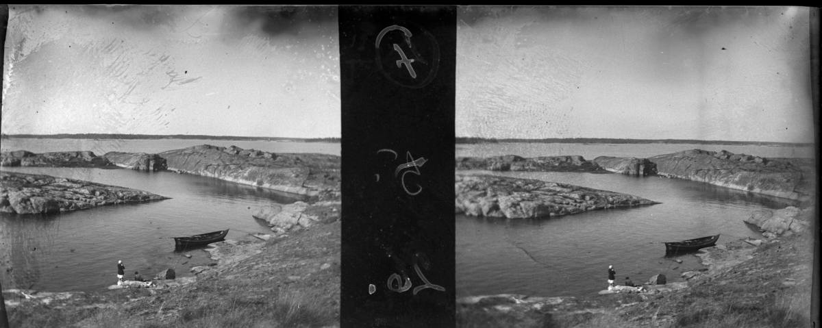 'Bildtext: ''Vid Uttergrytsklubben.'' :: Vy ut mot havet, på berghäll människor och invid ligger en båt. :: :: Ingår i serie med fotonr. 5262:1-16. Se även hela serien med fotonr. 5237-5267.'