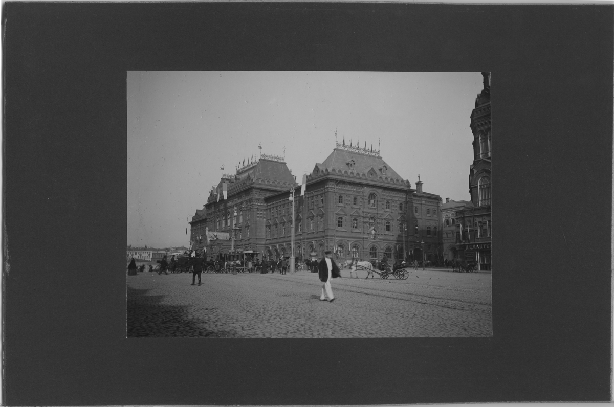 Stor byggnad med kullserstenstorg framför. På torget häst och vagnar och människor.
