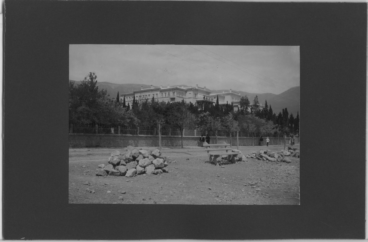 'I förgrunden öppen yta med högar med stenblock samt en bänk, bakom löper en väg med planterade träd och promenerande människor. Bakom en mur med staket ovanpå växer buskar och träd och här bakom ligger en stor byggnad. I fonden berg. :: :: Se serie med fotonr. 5270:1-15. Serie fotonr 5269-5292, Stuxbergs resa till Kaukasien, 1897.'