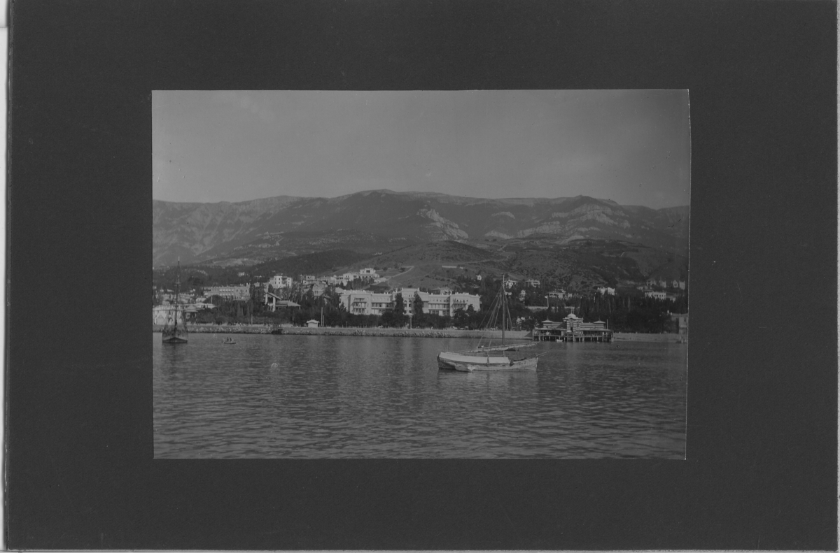 'Vy in mot ev. stad med hus nedanför berg. I vattnet båtar. :: :: :: Se serie med fotonr. 5271:1-15. Serie fotonr 5269-5292, Stuxbergs resa till Kaukasien, 1897.'