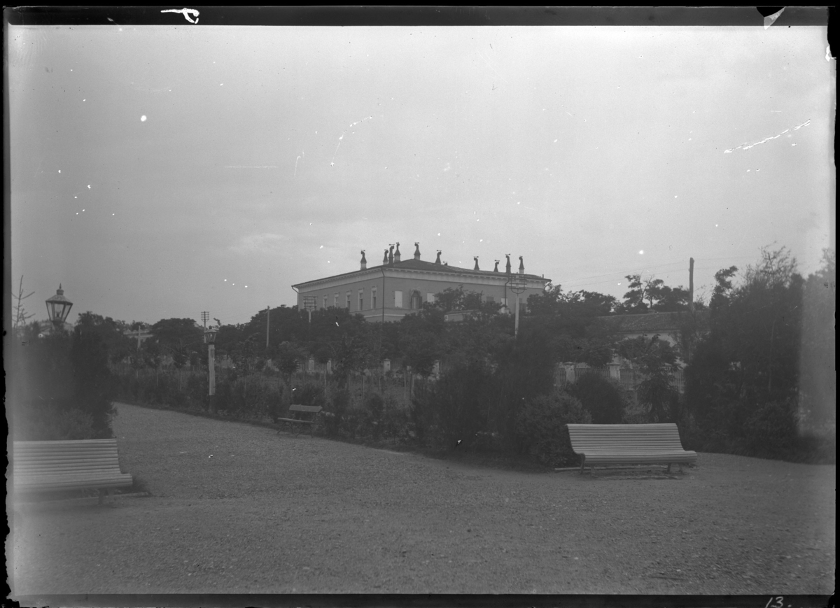 'Vy med del av park eller trädgård med träbänkar och promenadgång. På avstånd syns större byggnad. Planterade träd. :: :: Ingår i serie med fotonr. 5282:1-15. Se även fotonr. 5269-5292 med bilder från Stuxbergs resa till Kaukasien.'