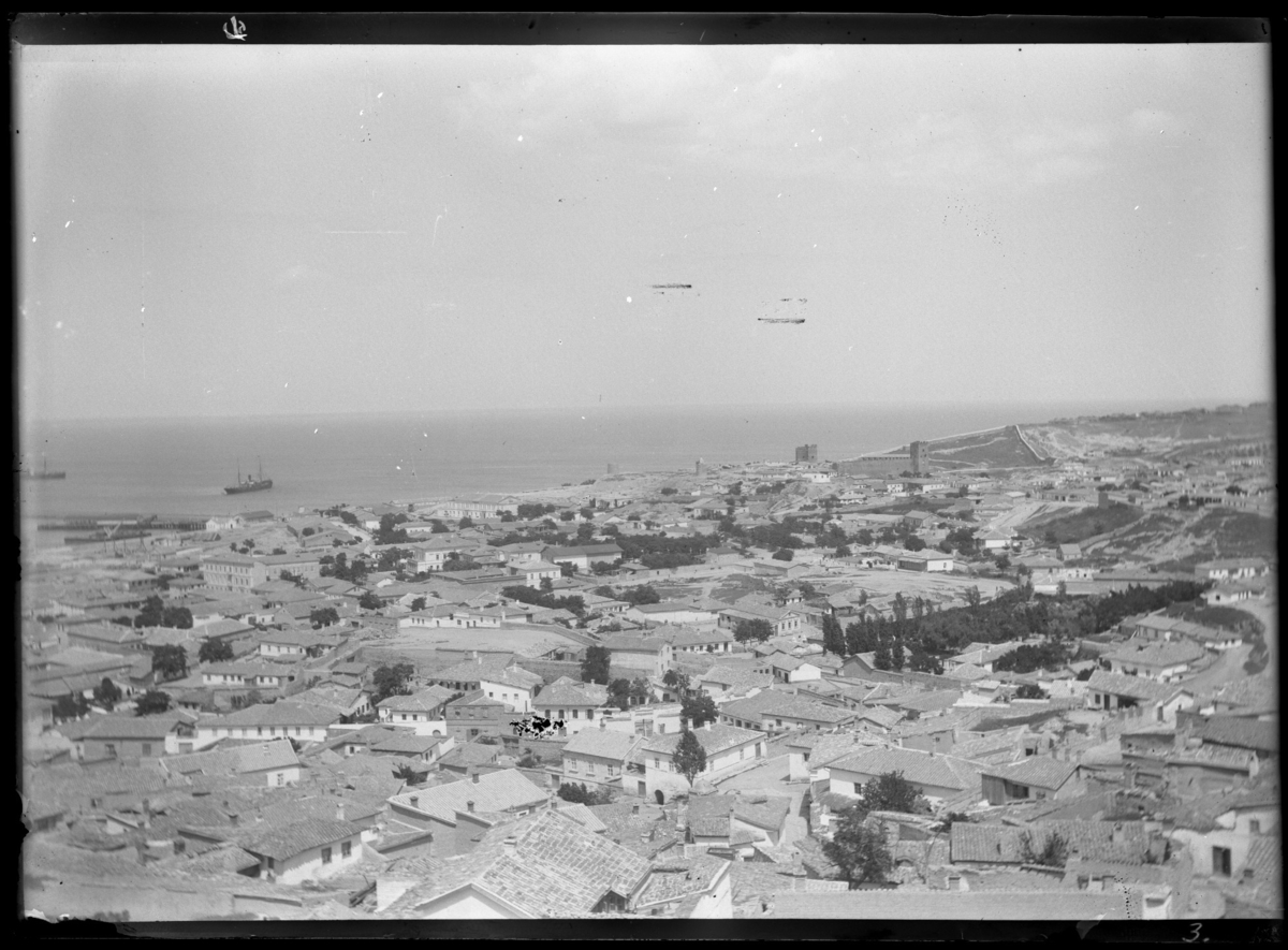 'Vy över del av stad med hamnen delvis synlöig till vänster och båtar i havet. :: :: Ingår i serie med fotonr. 5283:1-19. Se även fotonr. 5269-5292 med bilder från Stuxbergs resa till Kaukasien.'