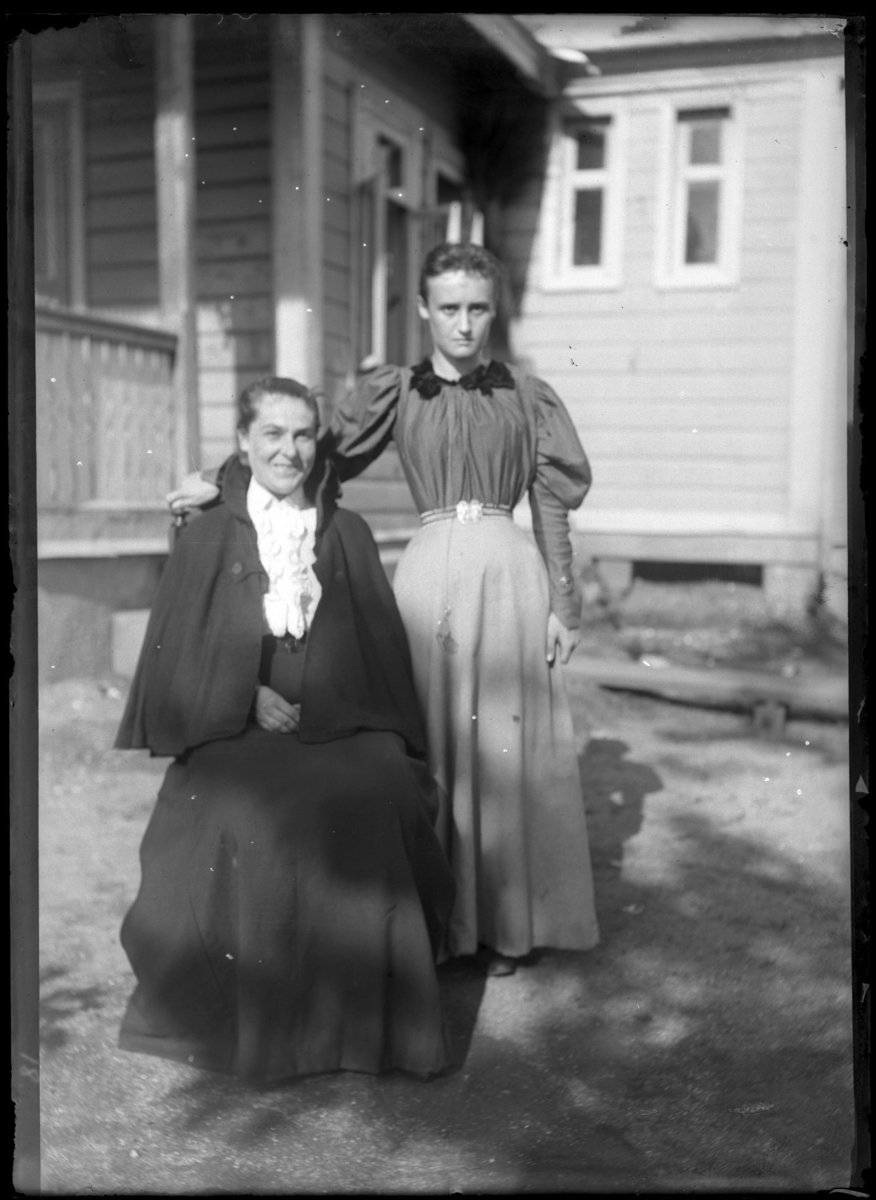 '2 kvinnor, 1 sittande och 1 stående intill framför ett hus. Kläder. Klädsel. :: :: Ingår i serie med fotonr. 5284:1-19. Se även fotonr. 5269-5292 med bilder från Stuxbergs resa till Kaukasien.'