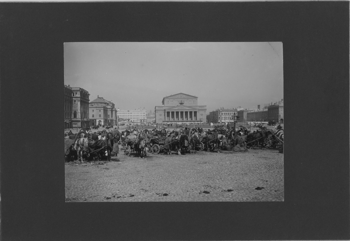 'Vy över torgplats, i förgrunden samling hästar och vagnar, ekipage, droskor. Hästar med havresäck runt huvudet, står och äter. Gatlykta. Stor öppen yta framför stor byggnad med pelare, detta är Bolsjojteatern. :: :: Ingår i serie med fotonr. 5288:1-30. Se även fotonr. 5269-5292 med bilder från Stuxbergs resa till Kaukasien.'
