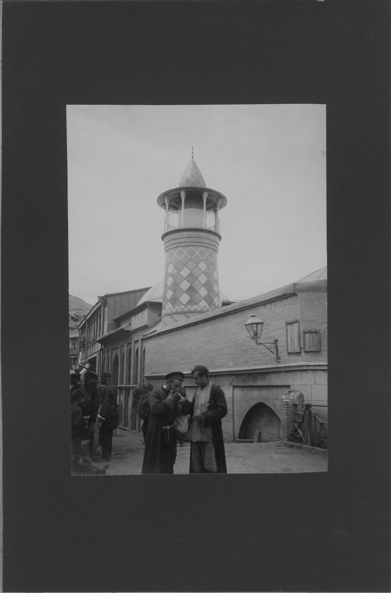 'Gatuvy, i förgrunden män och barn. Bakom dem byggnad med torn. :: :: Ingår i serie med fotonr. 5288:1-30. Se även fotonr. 5269-5292 med bilder från Stuxbergs resa till Kaukasien.'