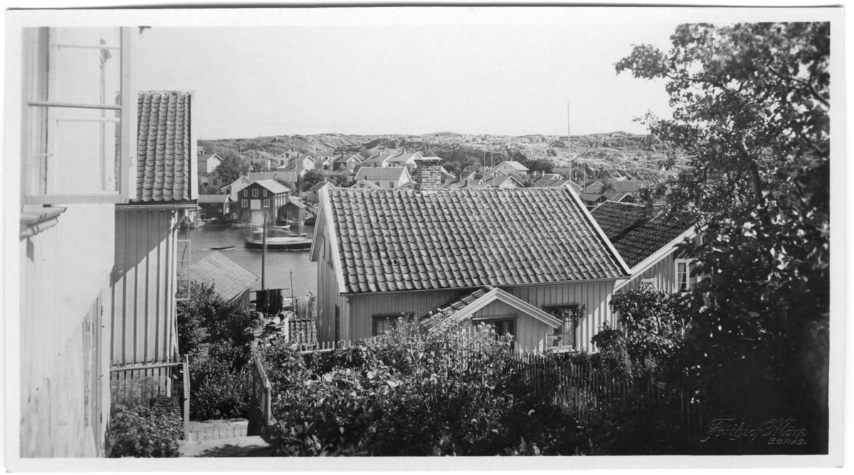 '''Idyll''. Vy från hustomt ut mot hav och bebyggelse. :: :: Serie fotonr 1888-1963.'